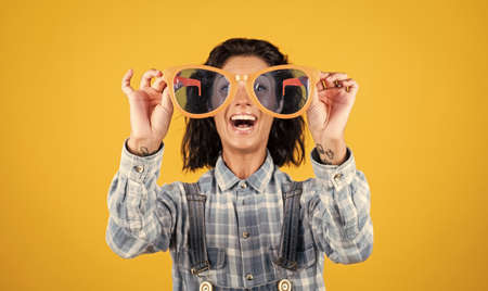 Portrait of beautiful cheerful young woman with charming expression and trendy glasses in front of a vibrant yellow background