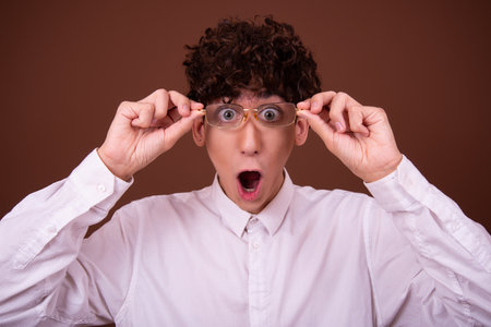 funny curly guy in a white t-shirt glasses emotions studio fashion