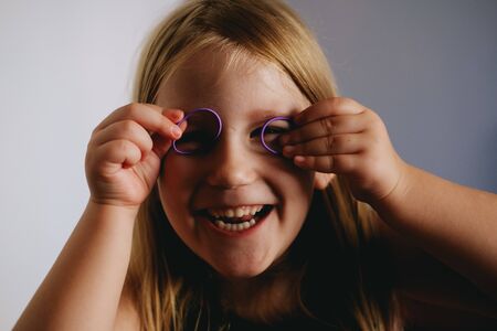 Happy school age child make fingers superhero mask sticking tongue out blue background, playing