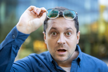 Man wearing glasses in a state of surprise and shock. The background is blurred with natural light.