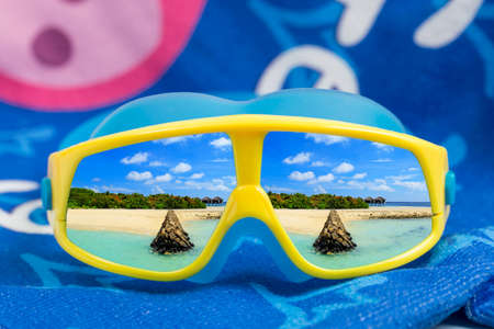 Swimming goggles on sand beach. Underwater diving equipment rubber glasses. Generate ai