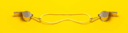 Sports whistle on yellow background. Concept - sport competition, referee, statistics, challenge. Basketball, handball, futsal, volleyball, soccer, baseball, football and hockey referee whistle