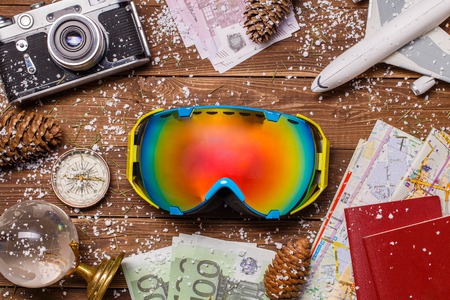 Ski Goggles Reflecting Snowy Mountains and Winter Landscape.