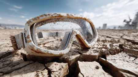 This image features dusty protective goggles resting on cracked earth, symbolizing environmental challenges and the urgent need for climate action.
