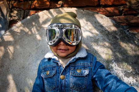 A pilot boy is wearing an old blue jeans jacket and hand gloves on a heavy winter day. A happy kid in a pilot costume and goggles. Close-up view on rustic damaged wall background.