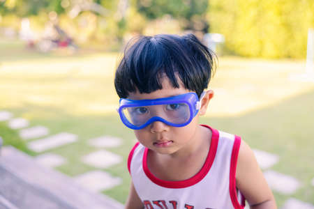 Close-up portrait Asian kids, Caucasian boy little child standing wearing a white vest and blue goggle making a smiling funny face at the camera on white background.