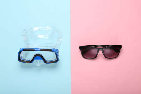 summer holidays. Diving mask and sunglasses on blue pink pastel background. Minimal beach vacation concept. top view