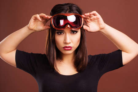 Woman with ski goggles isolated on brown