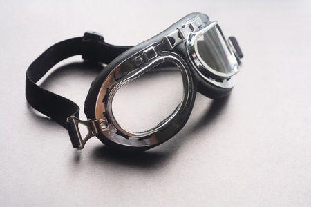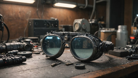 A pair of vintage goggles sits on a workbench, surrounded by tools and equipment