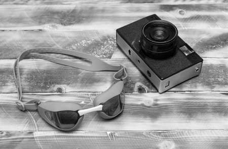 retro camera on a wooden table and swimming goggles