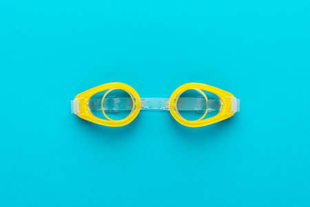 Flat lay shot of yellow swimming goggles over turquoise blue