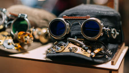 Cap of metal parts and glasses in the style of steampunk.