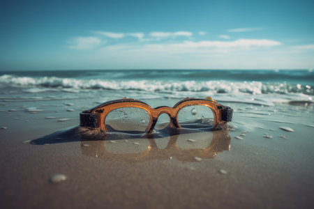 Swimming goggles on sand beach. Underwater diving equipment rubber glasses. Generate ai