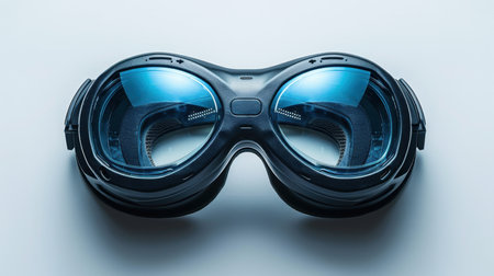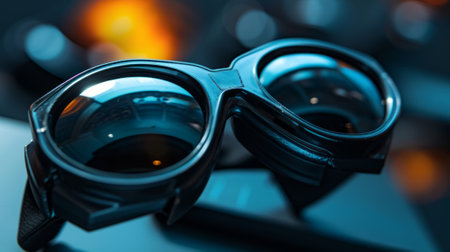 A pair of goggles with blue and purple lenses on a table, AI