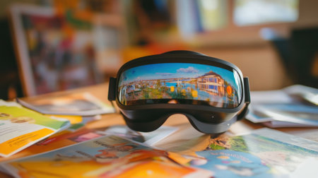 A closeup of a sleek augmented reality headset resting on a table surrounded by informational brochures about community programs. The headsets display hints at a virtual overlay invitin