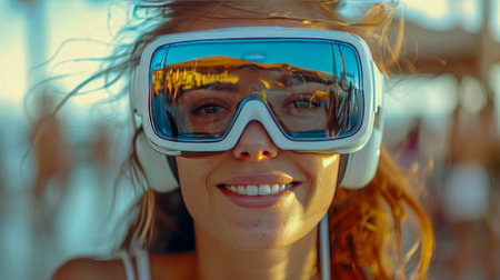 Happy woman experiencing virtual reality with VR headset.