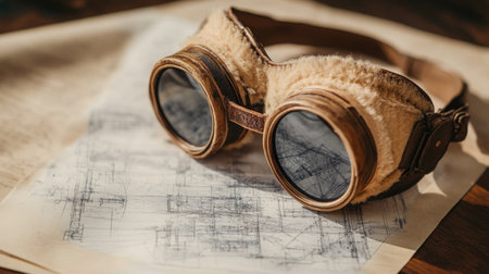 Artistic depiction of antique aviator goggles placed on detailed blueprints of the Wright Flyer capturing a creative and vintage aviation theme