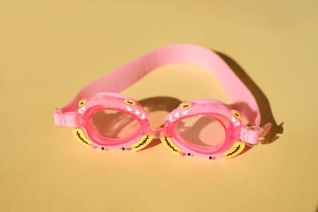 Children's yellow swimming glasses with crab-shaped frames on a pink background with deep shadows