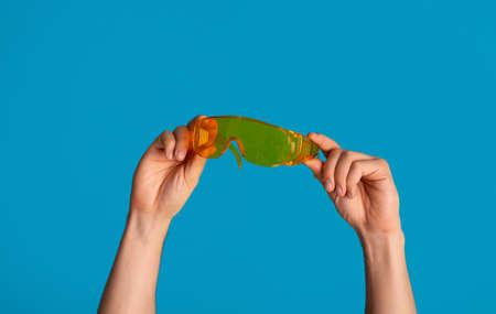 Young guy holding protective goggles on blue background, closeup. Panorama