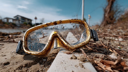 The image shows abandoned scuba goggles resting on a dirt path, revealing elements of nature and urban surroundings, evoking feelings of nostalgia and exploration.