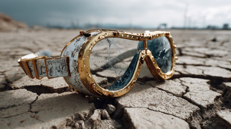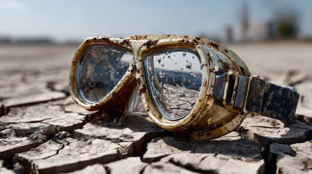 A pair of vintage goggles rests on cracked earth, showcasing a dry and desolate landscape. The reflections in the lenses capture an abandoned setting under bright sunlight, highlighting environmental decay.