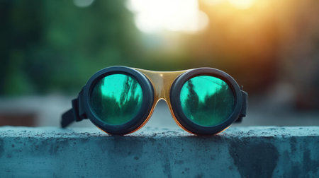 Industrial goggles with fading daylight behind, soft shadows stretching forward