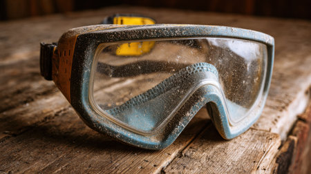 This image features a pair of weathered diving goggles resting on a rustic wooden surface, showcasing dust and textural details that evoke a sense of adventure and exploration.