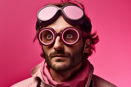 Funny man with glasses and a pink scarf on a pink background.