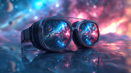 Experience the universe through glasses reflecting a breathtaking cosmic panorama.