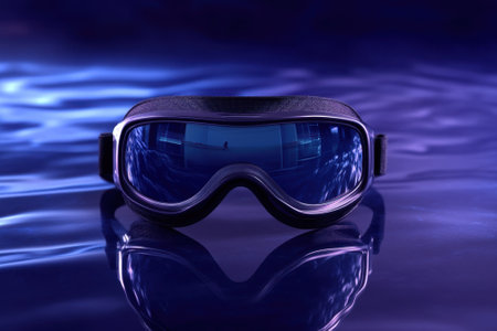 Diving goggles sit on a calm water surface, capturing reflections of vibrant blue tones and light.