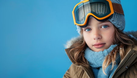 Close-up of a child with goggles, looking intently at the camera, with a warm, blurred background.