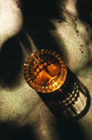 American bourbon whiskey in glass, rusty green background with shadow pattern and negative space