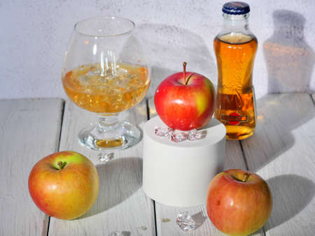 Glass of cognac with ice cubes and apples on a white table