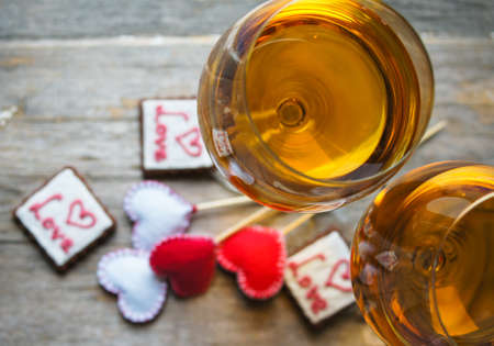 Glasses of white wine and cookies for Valentine's Day