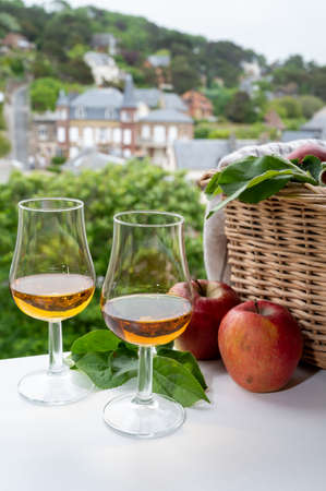 Tasting of strong alcoholic drink calvados made from apples in Normandy and view on old houses in Norman village, Calvados region, France
