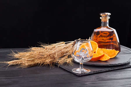 Whiskey with wheat and empty glass. Orange pieces and cognac on black background.