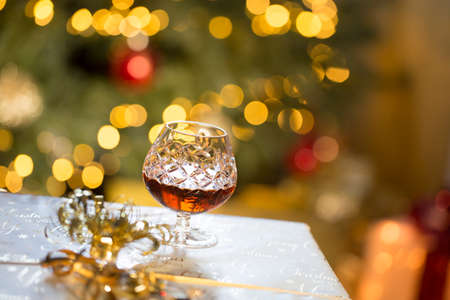 Christmas brandy glass on linen fabric background. Party rustic alcohol backdrop.