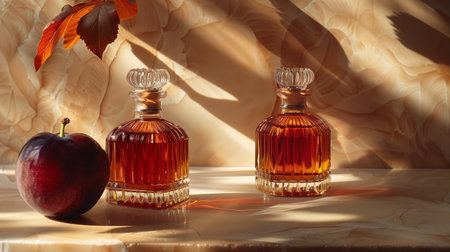 Elegant Glass Bottles of Amber Liquid Next to an Apple on a Marble Surface