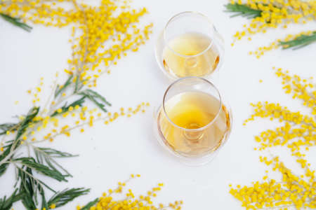 March 8 is a spring holiday. The number 8 is formed from two glasses of cognac on a white background close-up. A branch of yellow mimosa lies nearby. View from above