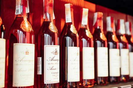 Lviv, Ukraine - February 20, 2022 : Bad Boy store, bottles with French alcohol at wine shop. Alcohol section in supermarket. Selective focus