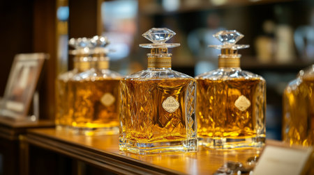 A sophisticated display of golden whiskey decanters, arranged in an opulent bar setting, exuding elegance and refinement.