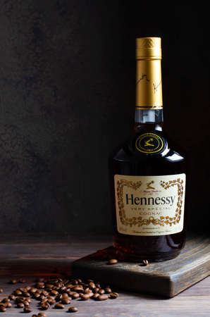 IZHEVSK, RUSSIA - July 20, 2020: Hennessy cognac in a bottle and coffee beans. Copy space