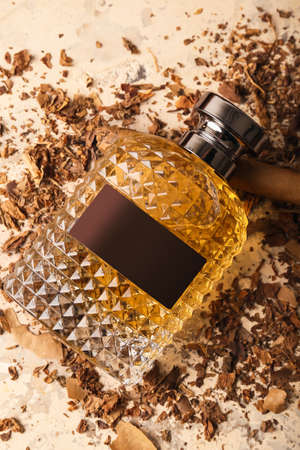 Stylish perfume bottle, cigar and tobacco on grunge background