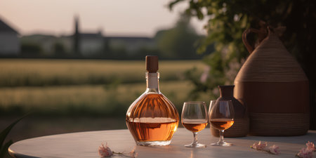 Cognac in the bottle and glasses on the table outdoors on background of winery yard