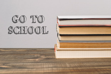 A stack of books with the word Go to School written on top. The books are arranged in a pyramid shape, with the top book being the largest and the bottom book being the smallest