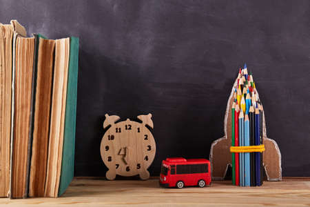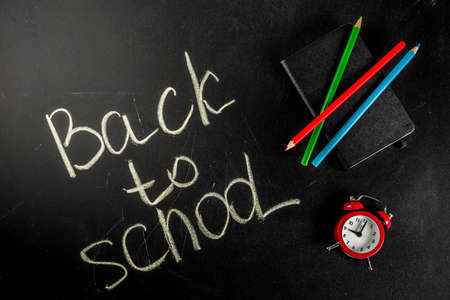 Back to school concept with books, alarm clock, color pencils, chalkboard background