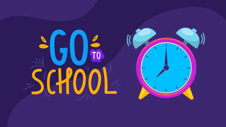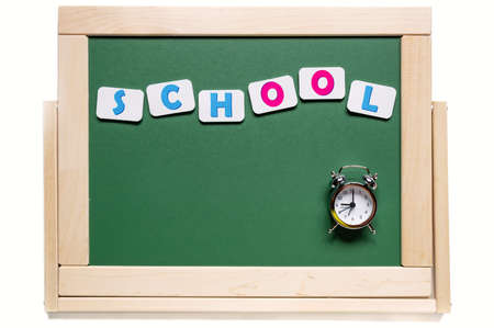 The inscription of the school is laid out on a green magnetic board. Back to school. The time on the alarm clock is 9:00, the beginning of the lesson.