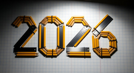 2026 new year numbers creatively formed by pencils and rulers on grid paper. Educational school supplies concept.