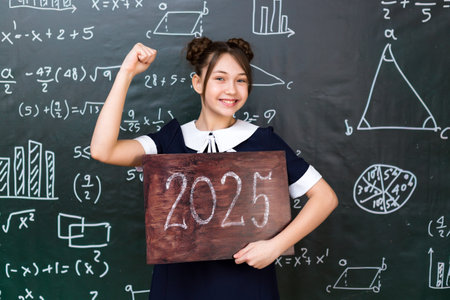 Back to school 2025 school year, schoolgirl holding a sign near the chalkboard.