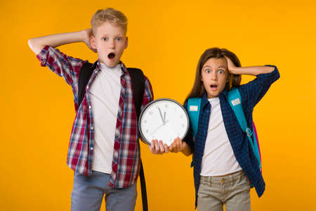 Portrait of two shocked schoolchildren holding clock, grabbing their heads isolated over yellow studio wall